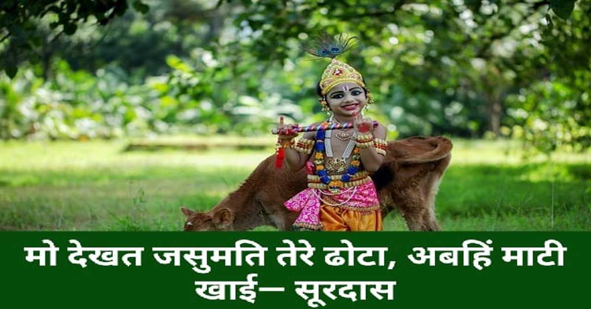 इन प्रकरणों 👇 के बारे में भी जानें। व्याख्या― ब्रज के ग्वाल-बाल एवं बालक श्री कृष्ण के मित्र माँ यशोदा के पास आकर कहते हैं, कि माता हमने अभी देखा है, कि तेरे पुत्र ने मिट्टी खाई है। ऐसा सुनकर यशोदा क्रोध के साथ उठती हैं और कान्हा की बाँह पकड़कर उन्हें ले आती हैं। वे अपने एक हाथ में अपने पुत्र की बाँह कसकर पकड़ लेती हैं, ताकि वह कहीं दूर न जा सके और दूसरे हाथ में एक डंडी लेती हैं। फिर वह कहती हैं, कि देख कन्हैया! यदि तूने अभी मिट्टी नहीं उगली तो मैं तुझे इस डंडी से मारूँगी। इस बात पर सफाई देते हुए बालक श्री कृष्ण कहते हैं, कि माँ ब्रज के ये सभी ग्वाल-बाल तुझसे झूठी बात कहते हैं। यदि तू मेरी बात नहीं मानती तो मैं तुझे अभी अपना मुँह खोल कर दिखा देता हूँ। ऐसा करने पर तो तू मुझ पर विश्वास कर लेगी।