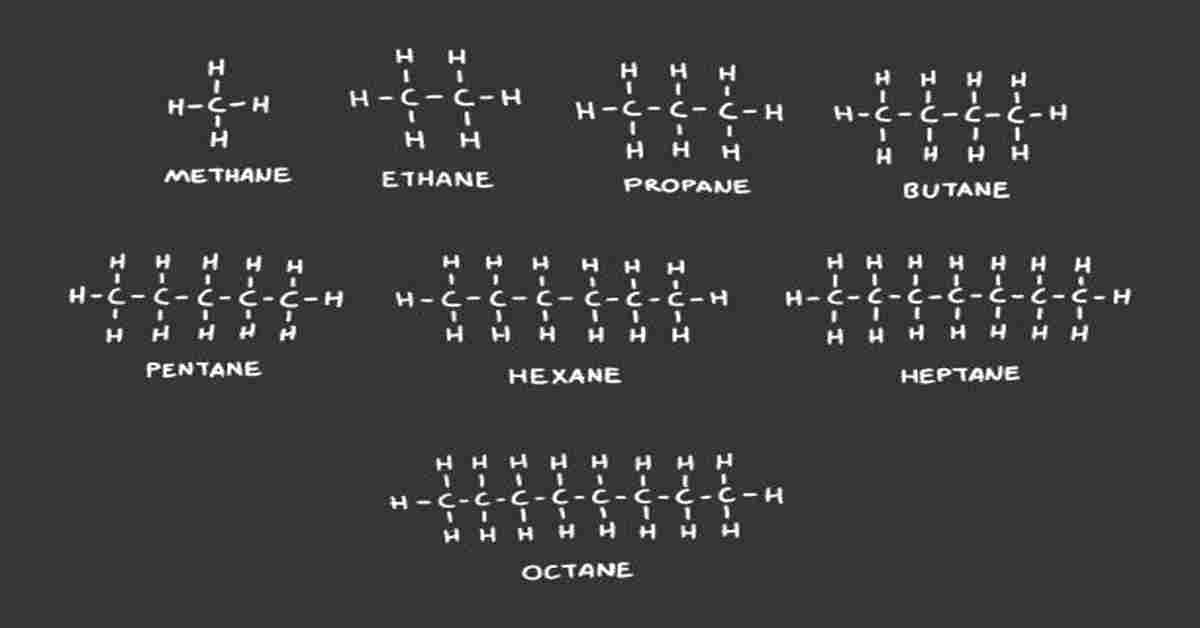 अभीष्ट संरचना सूत्र कार्बनिक पदार्थ एथेन का है। इसका सूत्र C2H6 होता है। इसी प्रकार प्रोपेन, ब्यूटेन आदि संतृप्त कार्बनिक यौगिकों के संरचना सूत्रों को लिखा जा सकता है। मेथेन, एथेन, प्रोपेन, ब्यूटेन आदि के द्वारा कार्बन परमाणुओं की एक श्रृंखला तैयार हो जाती है। इस श्रृंखला में दशों कार्बन परमाणु हो सकते हैं। इनमें से छः के नाम और सूत्र नीचे दिए गए हैं।