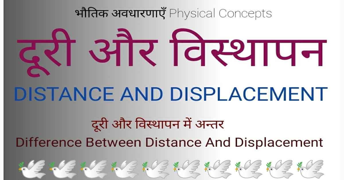 1. किसी वस्तु द्वारा किसी समय में तय किये गये रास्ते की लम्बाई को दूरी कहा जाता है। किसी समय में वस्तु की स्थिति निर्देशकों के अन्तर को विस्थापन कहा जाता है।