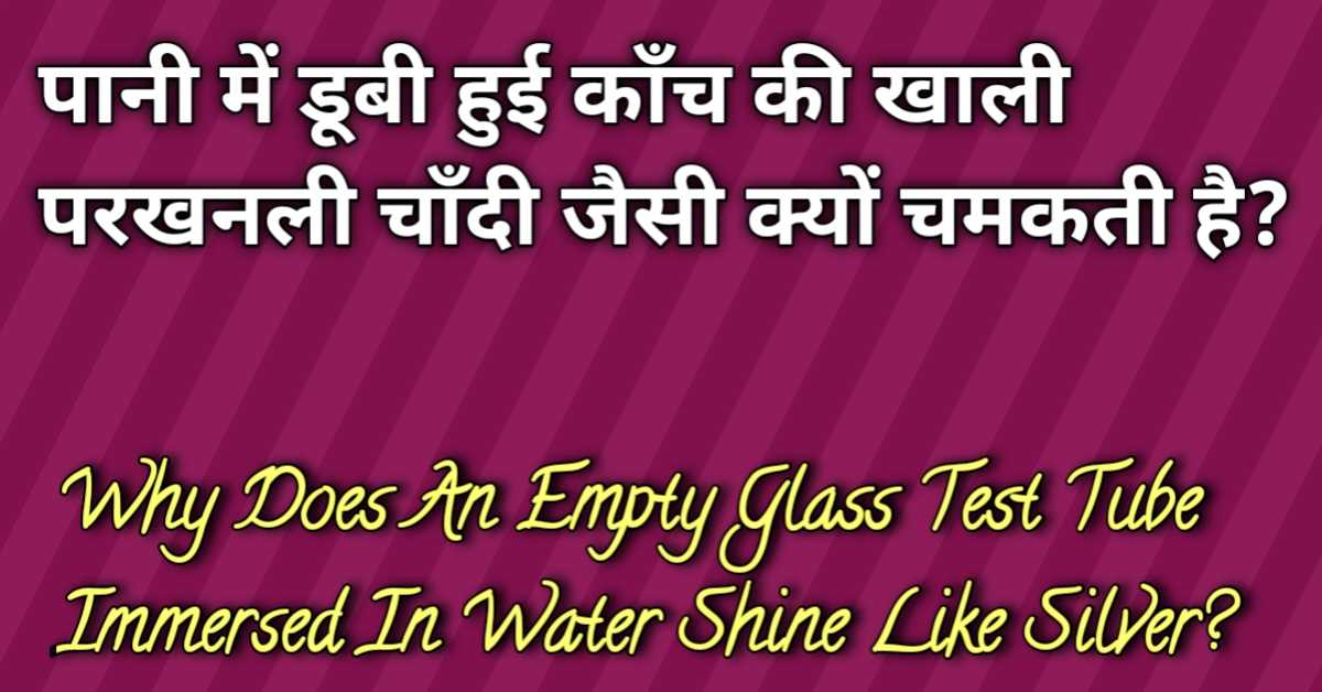 'प्रकाश के पूर्ण आन्तरिक परावर्तन' के कारण पानी में डूबी हुई काँच की खाली परखनली चाँदी जैसी चमकती हुई दिखाई देती है।